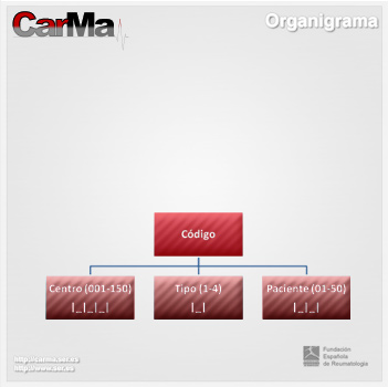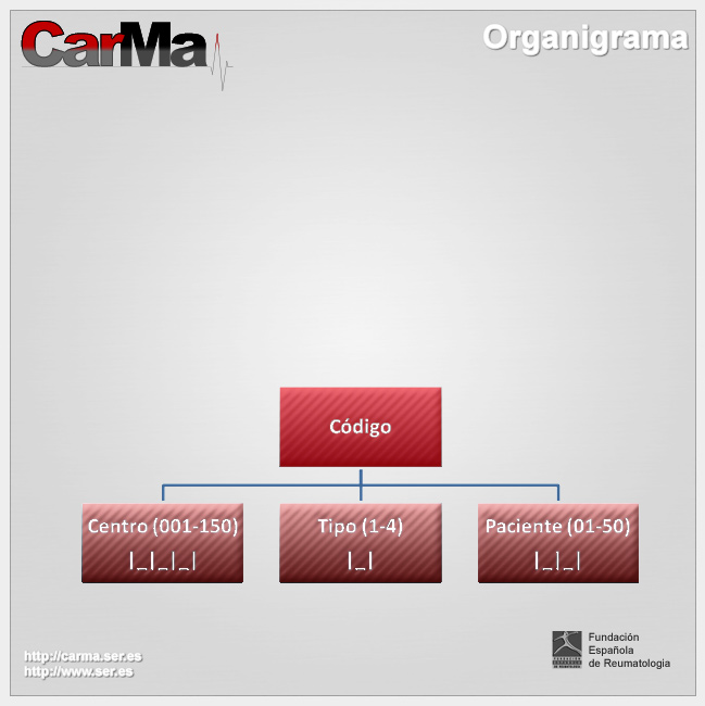 El código del paciente incluirá tres dígitos de la codificación del centro, uno de la codificación del tipo de paciente (1=AR, 2=EA, 3=APs, 4=control) y dos dígitos por el orden de inclusión, según la figura: